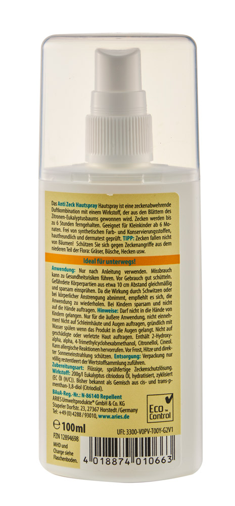 Das ARIES® Anti Zeck Hautspray ist eine zeckenabwehrende Duftkombination mit einem Wirkstoff, der aus den Blättern des Zitronen-Eukalyptusbaums gewonnen wird. Zecken werden bis zu 6 Stunden ferngehalten. Frei von synthetischen Farb- und Konservierungsstoffen, hautfreundlich und dermatest geprüft. Die Wirksamkeit ist wissenschaftlich belegt.