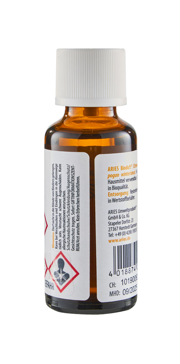 Anwendung: Das ARIES Bioduft® Citronellaöl ist als vielseitiges und duftendes Hausmittel oder als Zusatz für einen Saunaaufguss verwendbar.