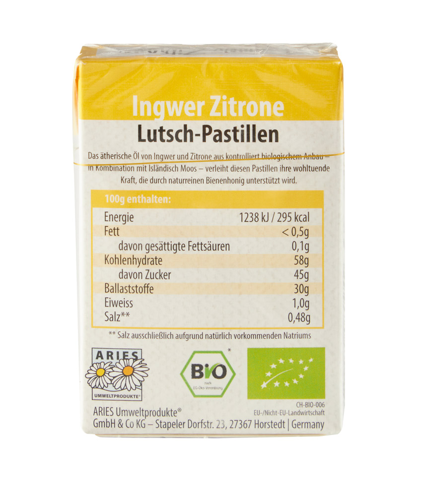 Geliermittel: Gummi arabicum*, Zucker*, Glukosesirup*, Bienenhonig*(7.5%), Isländisch Moos Extrakt* (1.4%), Zitronensaftkonzentrat* (0.8%), Zitronenöl* (0.5%), Ingweröl* (0.3%), Vanilleextrakt*, Trennmittel: Carnaubawachs*
