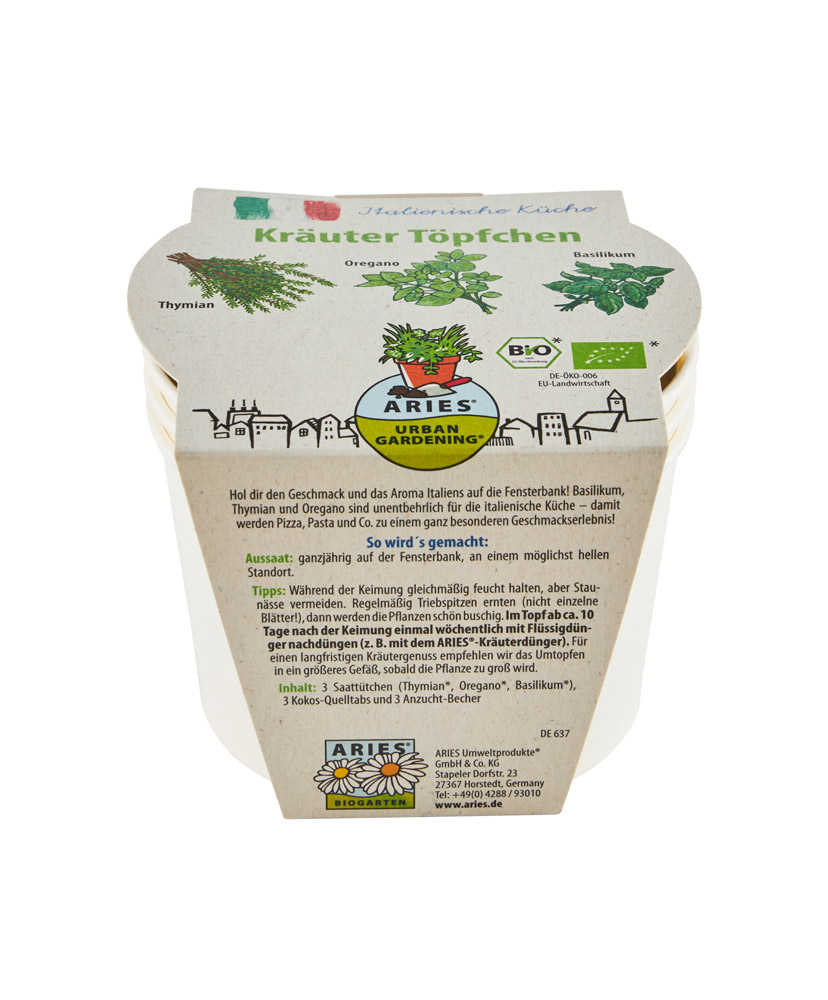 Mit dem ARIES®-Kräutertöpfchen „Italienische Küche“ holen Sie sich den Geschmack und das Aroma Italiens auf die Fensterbank! Basilikum*, Thymian* und Oregano* sind unentbehrlich für die italienische Küche und machen Pizza, Pasta und Co. zu einem ganz besonderen Geschmackserlebnis.