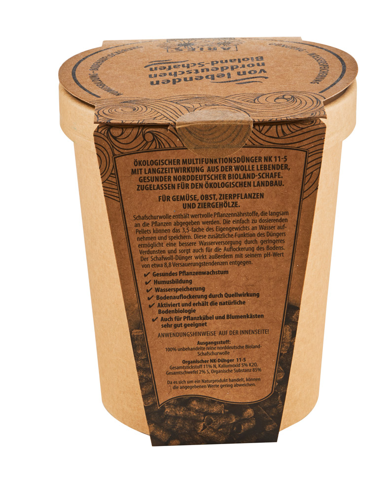 Ökologischer Universaldünger NK 11-5 mit Langzeitwirkung aus der unbehandelten Wolle lebender, gesunder, norddeutscher Bioland-Schafe. Für Gemüse, Obst, Zierpflanzen und Ziergehölze. Schafschurwolle enthält wertvolle Pflanzennährstoffe, die langsam an die Pflanzen abgegeben werden. Die einfach zu dosierenden Pellets können das 1,5-fache des Eigengewichts an Wasser aufnehmen und speichern. Diese zusätzliche Funktion des Düngers ermöglicht eine bessere Wasserversorgung durch geringeres Verdunsten und sorgt auch für die Auflockerung des Bodens. Der Dünger wirkt außerdem mit seinem pH-Wert von etwa 8,8 Versauerungstendenzen entgegen. 10 Monate Langzeitwirkung, dadurch auch prädestiniert für Pflanzkübel und Blumenkästen.