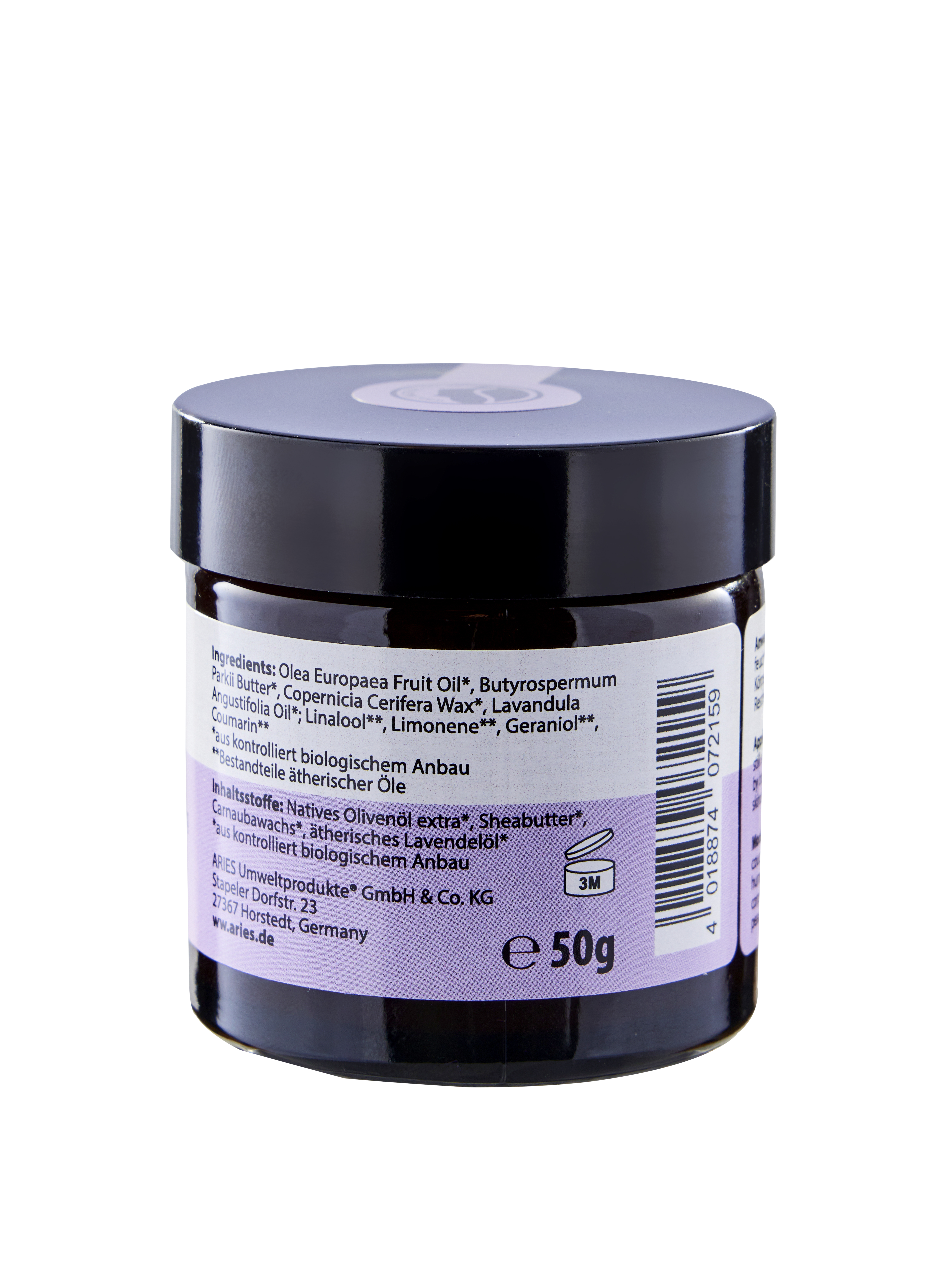 Inhaltsstoffe: Sheabutter roh*, Carnaubawachs*, Natives Olivenöl extra*, ätherisches Lavendelöl*