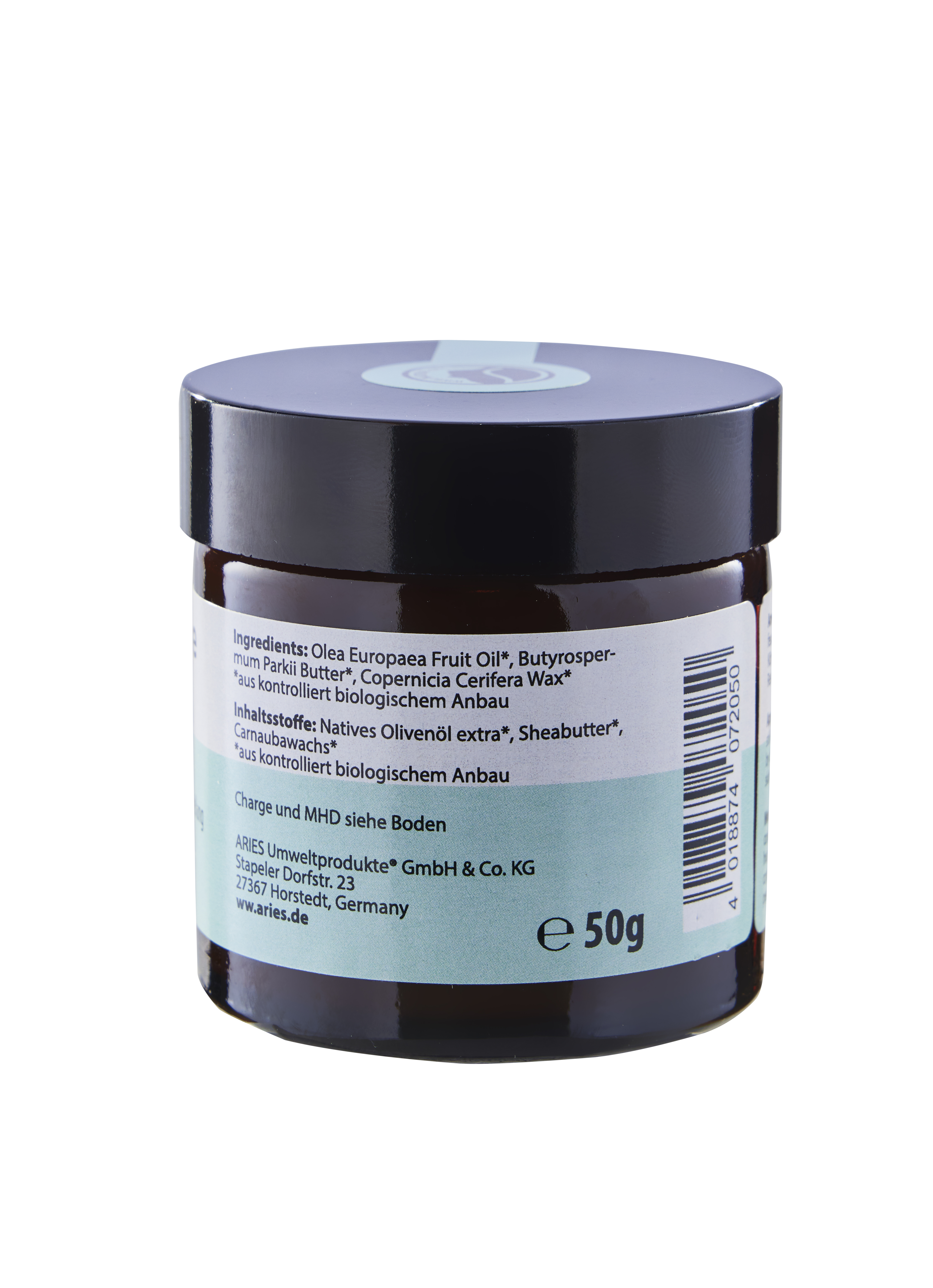 Inhaltsstoffe: Sheabutter roh*, Carnaubawachs*, Natives Olivenöl extra*