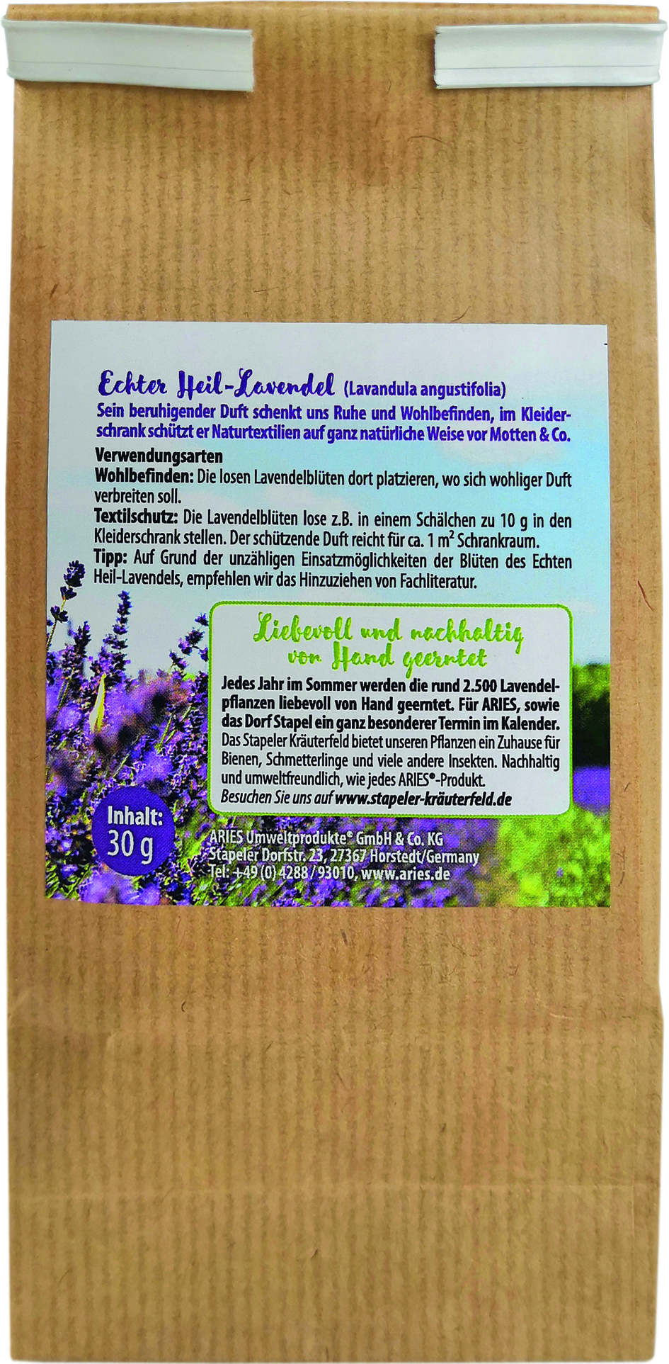 Auf unserer mit 5.000 m² wohl kleinsten Bioland-Anbaufläche Deutschlands wachsen zurzeit 2.000 liebevoll gepflegte Lavendelpflanzen. Die Lavendelblüten schenken uns mit ihrem beruhigenden Duft Ruhe und Wohlbefinden, im Kleiderschrank schützen sie Naturtextilien auf ganz natürliche Art und Weise vor Motten & Co. Viele weitere Einsatzmöglichkeiten vorhanden. Limitierte Auflage.