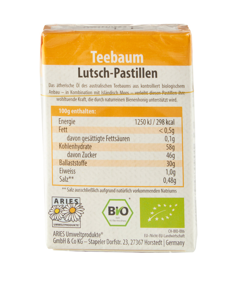 Das ätherische Öl des australischen Teebaums (Melaleuca alternifolia) verleiht der Pastille in Kombination mit Isländisch Moos ihre wohltuende Kraft, unterstützt durch naturreinen Bienenhonig. Unser Klassiker unter den ARIES® Bio-Pastillen und für viele unverzichtbar, nicht nur in der erkältungsgefährdeten Zeit. Ein wohlschmeckendes Schweizer Qualitätsprodukt für jede Jahreszeit!